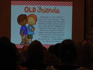 First Grade Parade. This session was all about reader's workshop. Cara talked a lot about how her room runs and it gave me some ideas for my own classroom. One of my favorites was her "old friends" books. This is a tub of books were the familiar reads go. Even the nonreaders are able to read from this bin. I also liked the "birthday book". Students have the opportunity to donate a book to the class library for their birthday. The child holds the book and Cara takes a picture of them then puts it in the book as a bookplate and has the child sign the inside of the book. These books go to a special bin in her classroom library. So cute! I thought it would be great to read the book to the class or have the child read it to the class if they would like to. Cara wrote a post about her day, you might want to check it out